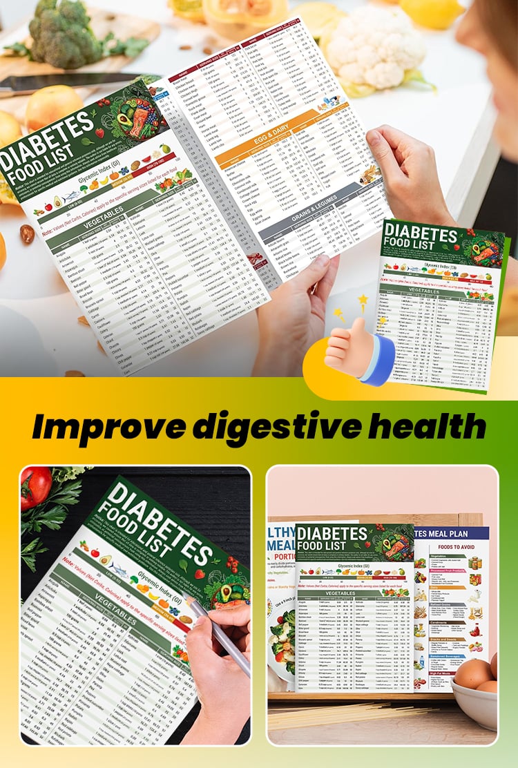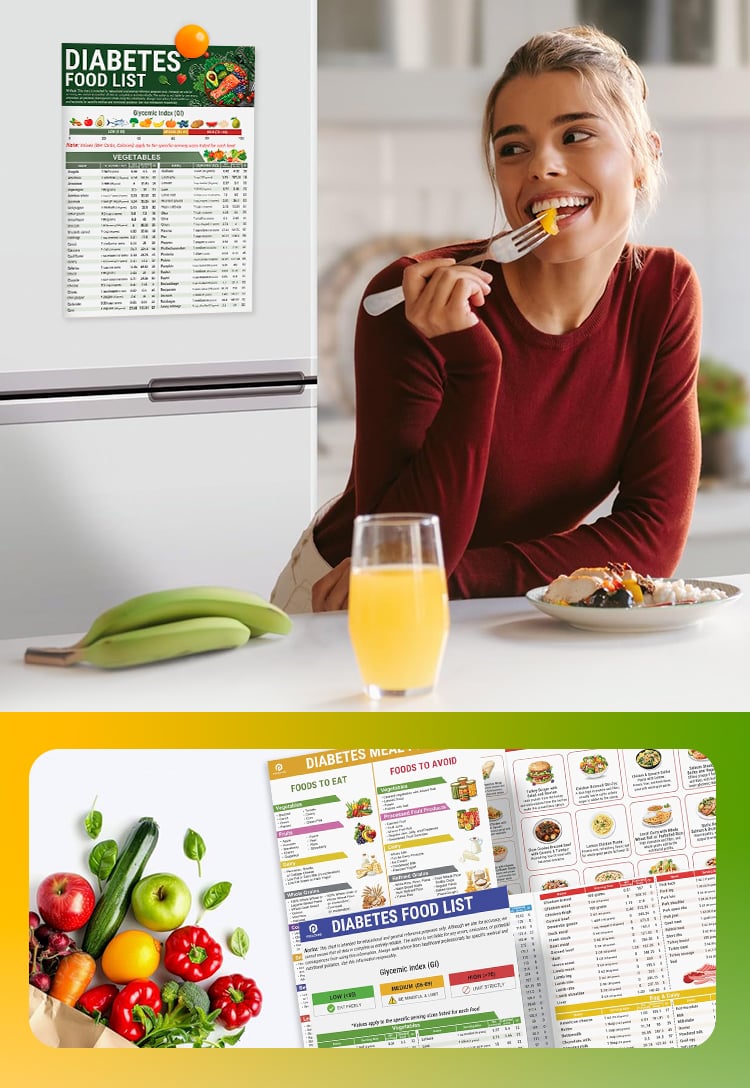 This product features a detailed diabetic food guide, including a low glycemic index foods list and a diabetic diet food list, to support better meal planning for individuals managing diabetes or gestational diabetes.