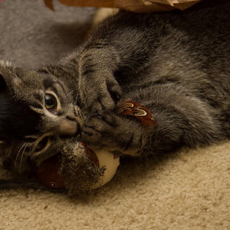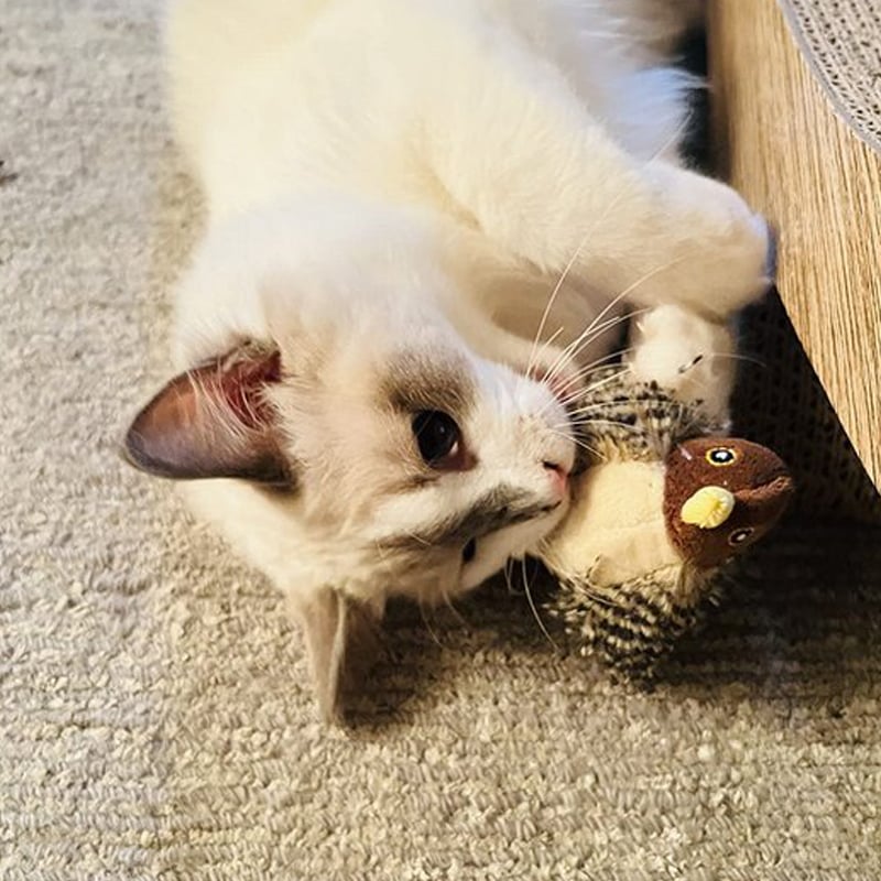 Looks pretty realistic like a fledgling songbird. Kitten has been tapping it, thumper kicking it, biting it and getting the zoomies. She loves napkins and crinkled paper products a lot, but this might be her new favorite! Every time she touches it, it makes bird noises.